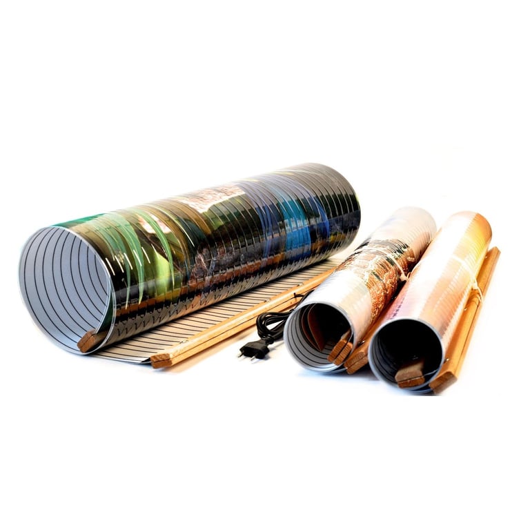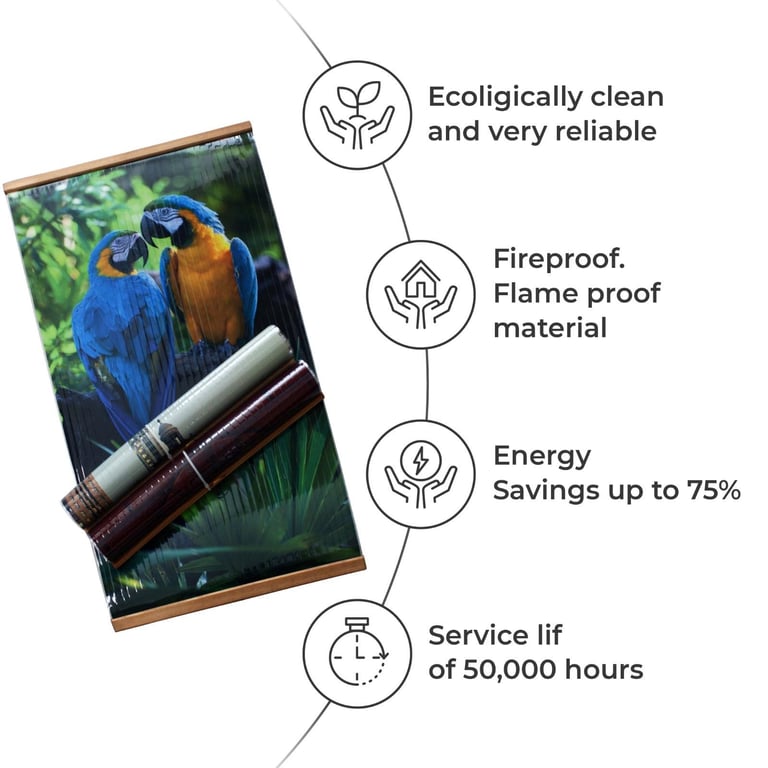 This innovative heater features a flexible film design, with carbon filament sandwiched between two layers of thermal film—the same safe material used in medical applications. As the carbon filament heats up, it generates infrared heat that’s directed into the room via a reflective screen on the back. Wooden or plastic strips at the top and bottom ensure the heater doesn’t sit flush against the wall, preventing unnecessary heating of the surface. Equipped with a cord and standard 220V plug, the front of the heater is adorned with a decorative image, offering various designs to suit any interior. Despite its multi-layered build, the heater remains thin and lightweight, making it easy to move. Infrared heat is particularly beneficial for bedrooms and children’s rooms, offering warmth without drying out the air.